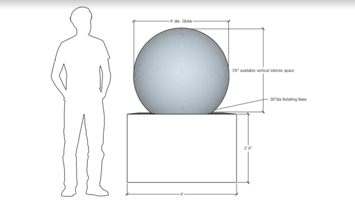 For Snow Globes: Sculptural/3-dimensional aspects that fit the 30” rotating base. These bases spin constantly, and as such it is recommended you do not design your installation to be more than 30 pounds. Full dimensions of the Snow Globes are shown at the end of this Call. The plexi globe has a seam down the center of the plexi so please have this in mind as you consider how your design will be enclosed. Lighting for the Snow Globes must not exceed 20 amps.